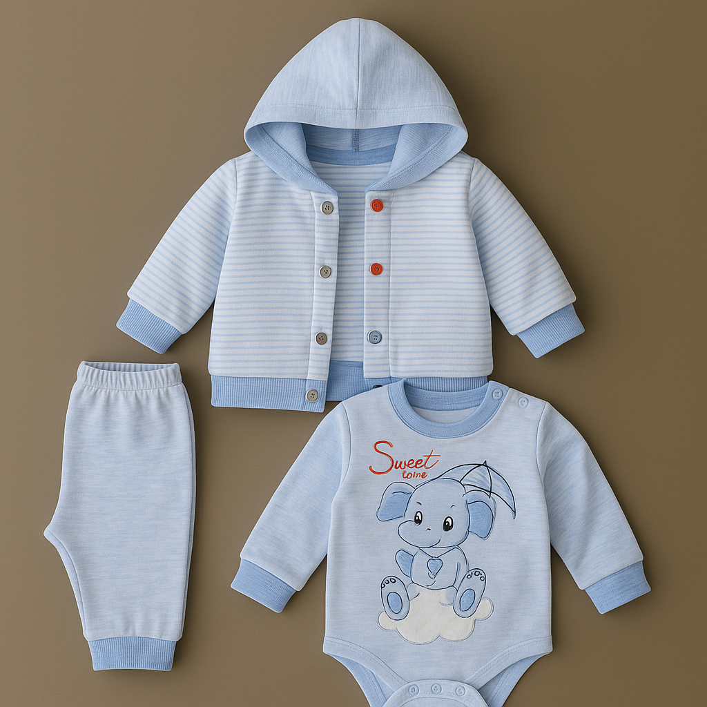 Un compleu adorabil și confortabil, perfect pentru zilele răcoroase! Setul este realizat din bumbac moale și respirabil, ideal pentru pielea delicată a bebelușilor. Detalii produs: Bluziță cu glugă, în dungi fine bleu, cu capse colorate; Body cu mânecă lungă, cu imprimeu drăgălaș cu elefănțel și mesajul „Sweet time”; Pantaloni comozi, cu manșete elastice și croi…