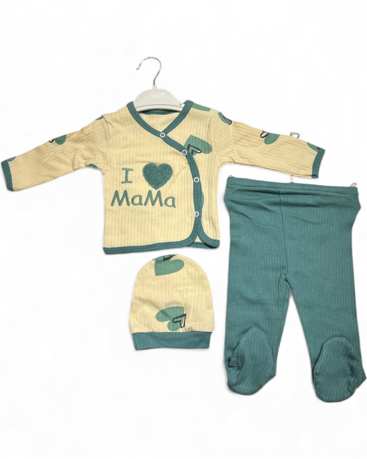 compleu din 3 piese pentru bebeluși, decorat cu mesajul „I ❤️ Mama”. Setul este confecționat din 100% bumbac, un material moale și delicat, ideal pentru pielea sensibilă a nou-născuților.