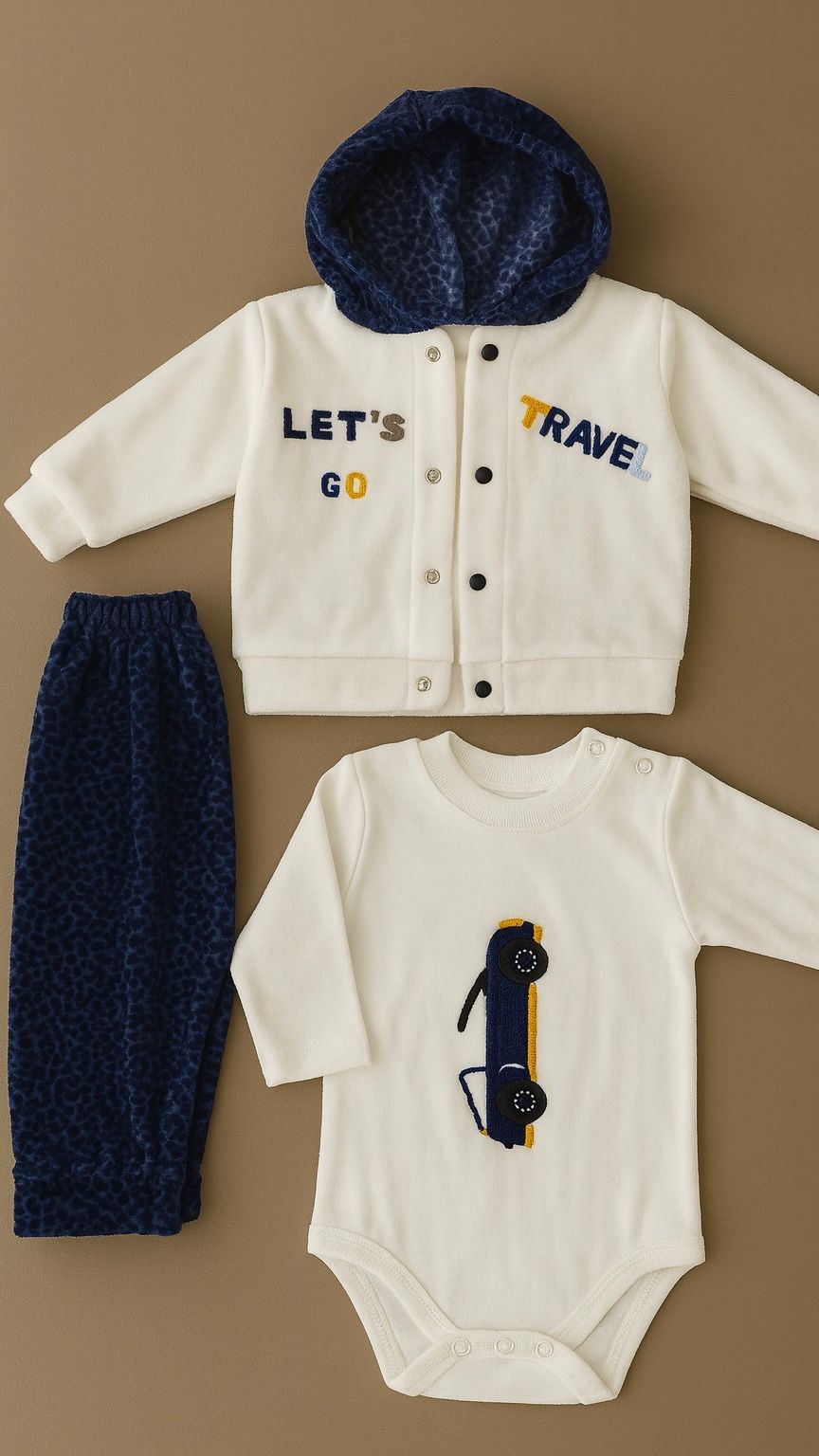Răsfățați micuțul cu un compleu de catifea moale și elegant, ideal pentru sezonul rece. Setul conține trei piese: