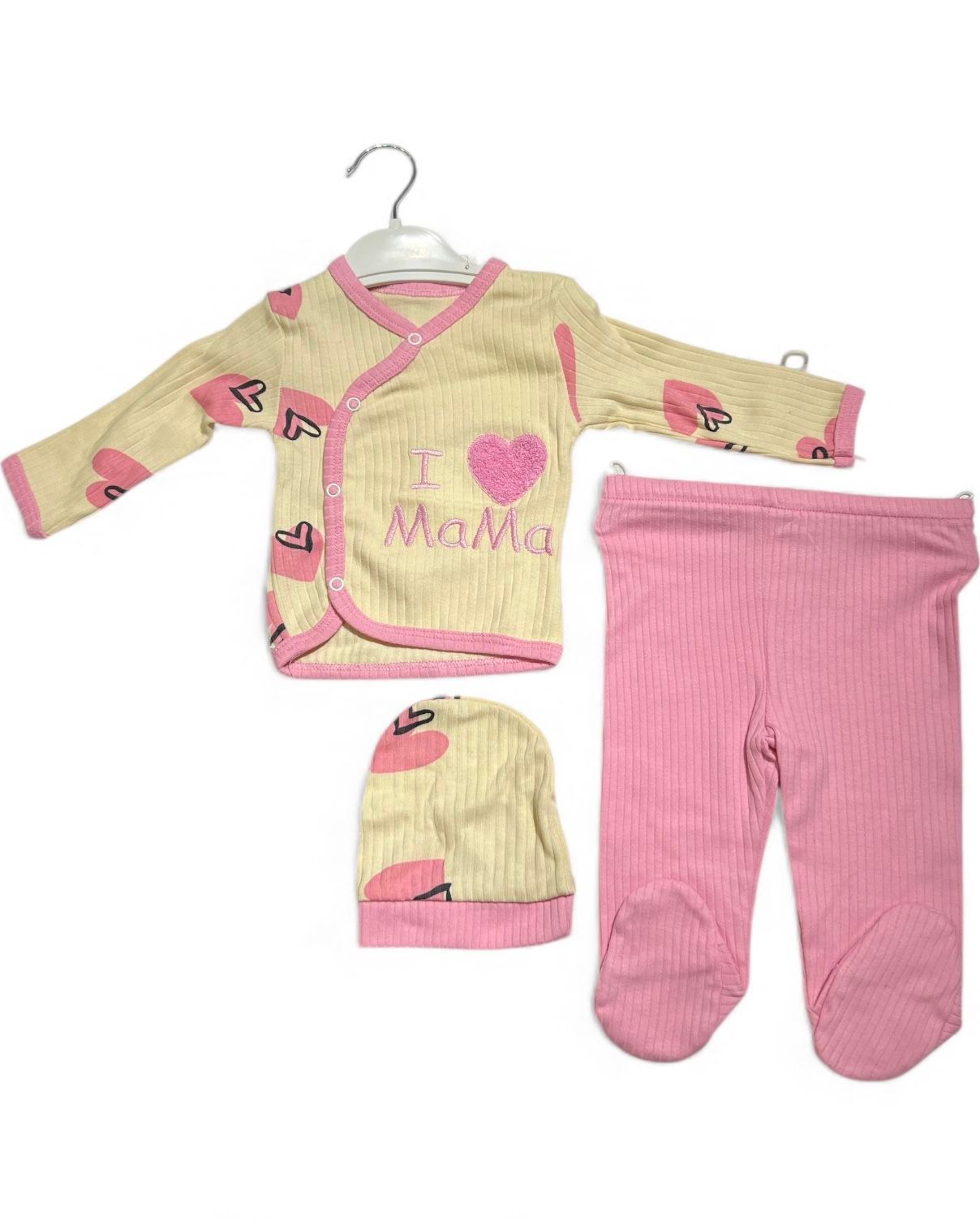 compleu din 3 piese pentru bebeluși, decorat cu mesajul „I ❤️ Mama”. Setul este confecționat din 100% bumbac, un material moale și delicat, ideal pentru pielea sensibilă a nou-născuților.